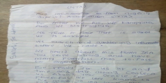 The discovery of a threatening letter purportedly dumped at the Ira market area, warning of an imminent terrorist attack, has caused new alarm among the inhabitants of the Ira, Inaja, and Aho communities in the Oyun Local Government Area of Kwara State.